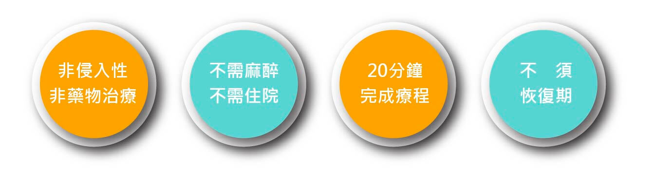 體外震波治療是一種非侵入性、非藥物治療,過程中不需麻醉,不需住院,每次治療大約15-20分鐘,治療完可以馬上恢復正常作息。
