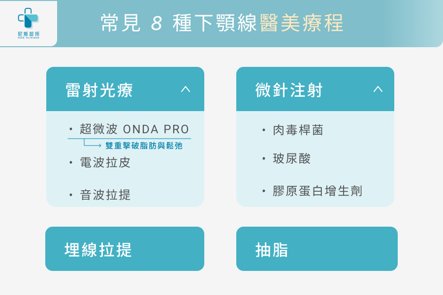 接下來,我們整理了 ONDA PRO、電音波、肉毒、玻尿酸、埋線拉提與抽脂等的 8 種下顎線醫美療程,幫助你了解不同方法如何對症下藥。